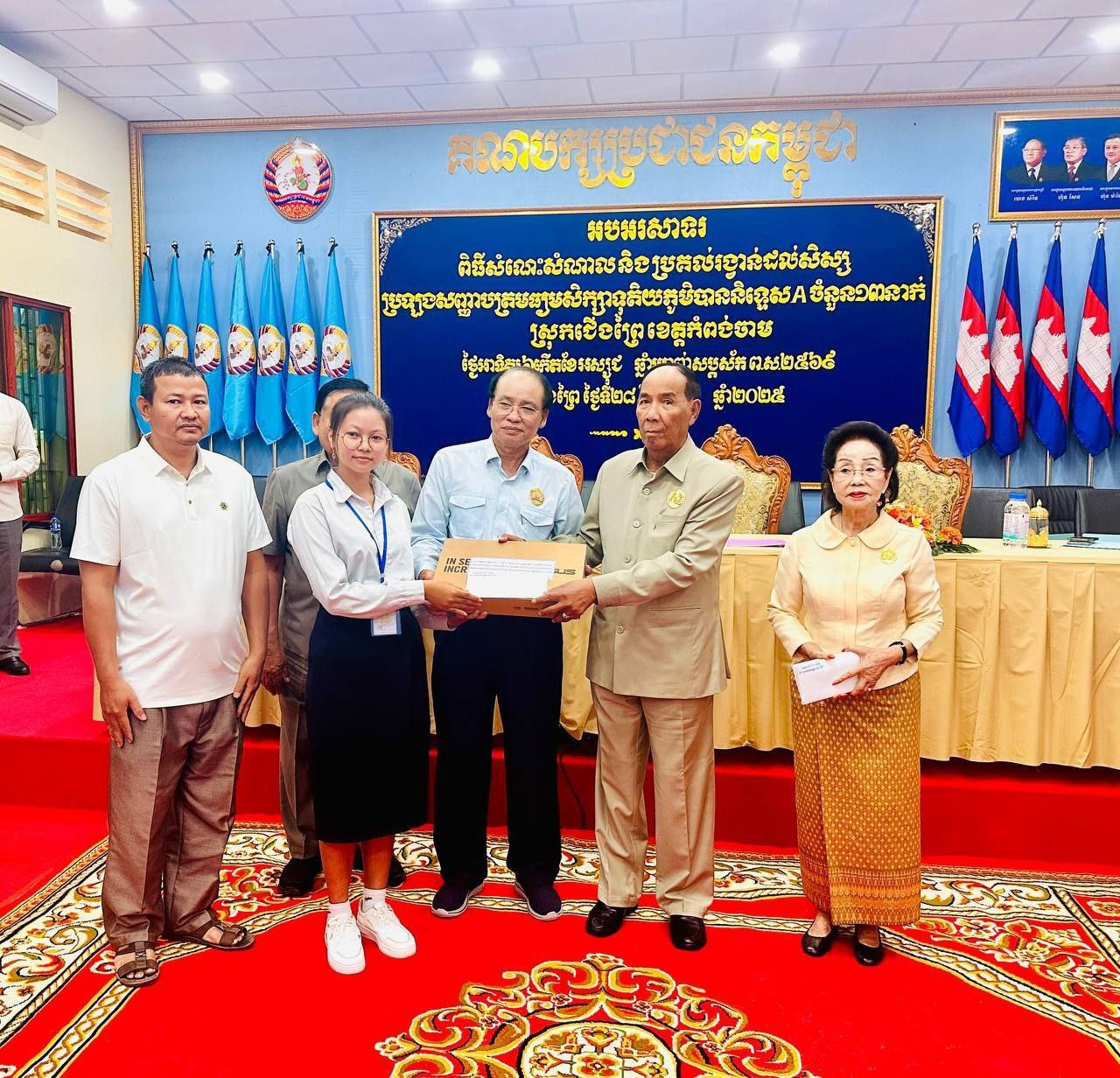 ក្នុងឱកាសនោះដែរ ឯកឧត្តម លោកជំទាវគណៈអធិបតី បានប្រគល់ជូននូវរង្វាន់លើកទឹកចិត្តដល់សិស្សដែលបានខិតខំប្រឹងប្រែងរៀនសូត្រ រហូតទទួលបានជ័យលាភីនិទ្ទេសA ចំនួន១៣នាក់ ដោយម្នាក់ៗទទួលបាននូវ កុំព្យូទ័រ១គ្រឿង និងថវិកាចំនួន១.០០០.០០០រៀល។