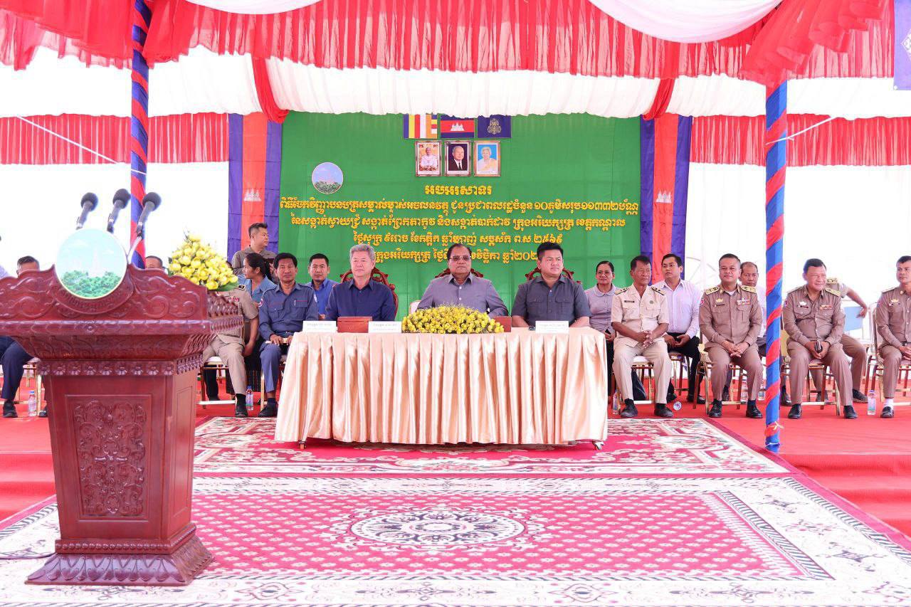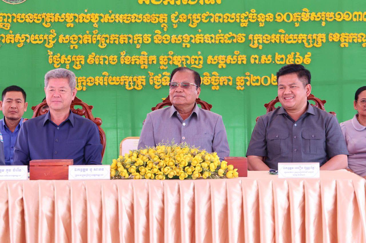 នាថ្ងៃទី១៤ ខែវិច្ឆិកា ឆ្នាំ២០២៥ ឯកឧត្តមរដ្ឋលេខាធិការ ឈឿន ប៊ុណ្ណារ័ត្ន និងឯកឧត្តមអភិបាលខេត្តកណ្តាល គួច ចំរើន អញ្ជើញជាសហធិបតីក្នុងពិធីចែកវិញ្ញាបនបត្រសម្គាល់ម្ចាស់អចលនវត្ថុចំនួនសរុបចំនួន ១១,៣៣២ ប័ណ្ណ ជូនបងប្អូនប្រជាពលរដ្ឋ ចំនួន១០ភូមិ ស្ថិតនៅ សង្កាត់ស្វាយជ្រុំ សង្កាត់ព្រែកតាកូវ និងសង្កាត់បាក់ដាវ ក្រុងអរិយក្សត្រ ខេត្តកណ្ដាល៕
