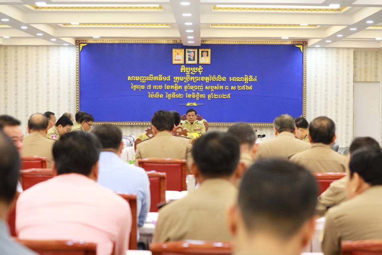 ប៉ៃលិន៖ នាព្រឹកថ្ងៃទី១៧ ខែវិឆ្ឆិកា ឆ្នាំ២០២៥ ក្រុមប្រឹក្សាខេត្តប៉ៃលិន បានបើកកិច្ច ប្រជុំសាមញ្ញលើកទី១៨ អាណត្តិទី៤ របស់ខ្លួន ស្ថិតក្រោមអធិបតីភាព ឯកឧត្តម ជា ចាន់ឌិន ប្រធានក្រុមប្រឹក្សាខេត្ត និង លោកជំទាវបណ្ឌិត បាន ស្រីមុំ អភិបាលនៃគណៈអភិបាលខេត្តប៉ៃលិន ព្រមទាំងមានការចូលរួមពីសំណាក់ឯកឧត្តម លោកជំទាវ សមាជិកក្រុម ប្រឹក្សាខេត្ត, គណៈអភិបាលខេត្ត នាយក នាយករងរដ្ឋបាលខេត្ត នាយកទីចាត់ការ លោក–លោកស្រី ប្រធានមន្ទីរអង្គភាព ស្ថាប័នជុំវិញខេត្ត និងអាជ្ញាធរក្រុង–ស្រុក ជាច្រើននាក់ផងដែរ។
