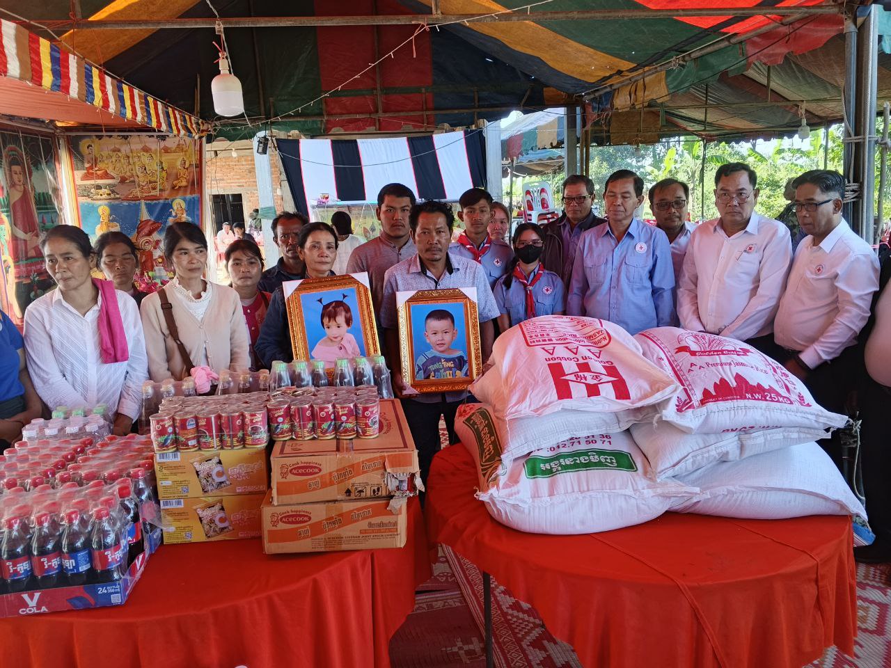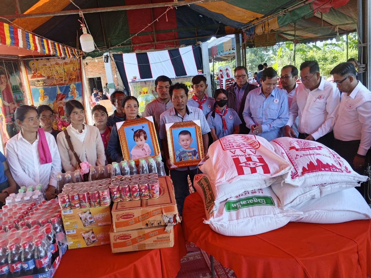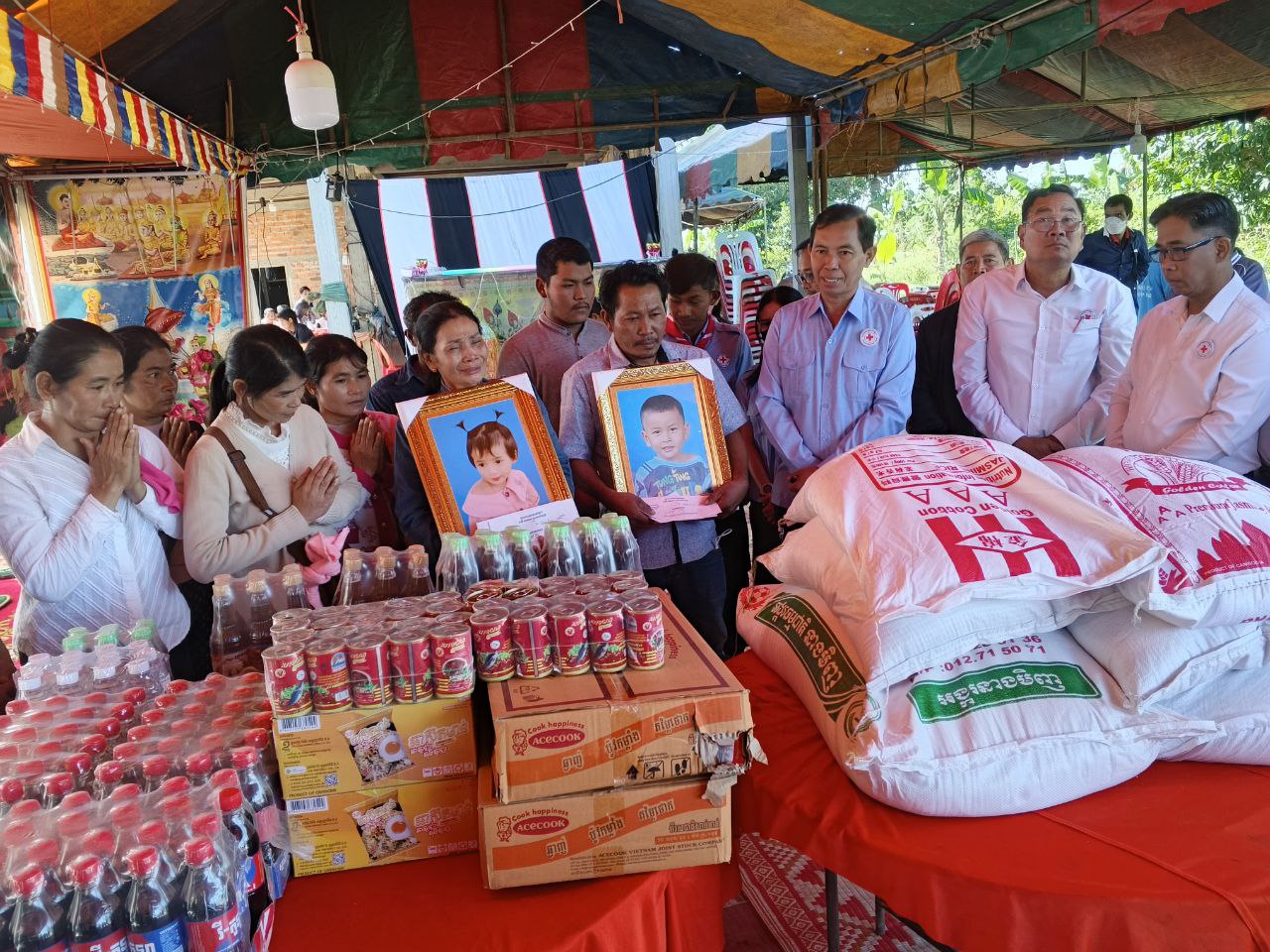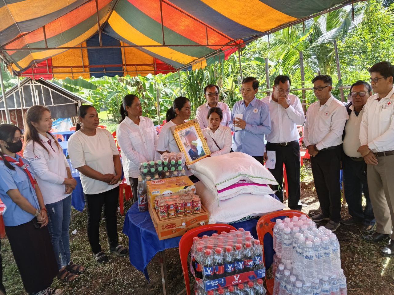 លោក ឃុនវុទ្ធី អនុប្រធានគណៈកម្មាធិការសាខាកាកបាទក្រហមតំណាងឯកឧត្តម អ៊ុំ រាត្រី ប្រធានគណៈកម្មាធិការសាខា មានទឹកចិត្តអាណិតជាពន់ពេក ចំពោះសពក្មេងៗ ហើយក៏ចូលរួមរំលែកទុក្ខដ៏សែនក្រៀមក្រំនិងបានចូលរួមសោកស្ដាយចំពោះ ក្រុមគ្រួសារដែលបានបាត់បង់កូន ជាទីស្រឡាញ់ក្នុងនាមសាខាកាកបាទក្រហមខេត្ត ក៏សូមធ្វើការផ្ដាំផ្ញើក៏ដូចជាការអំពាវនាវដល់អាណាព្យាបាលទាំងអស់សូមកុំឲ្យមានការធ្វេសប្រហែស ចំពោះកូនចៅលេងទឹក ដោយគ្មានមនុស្សធំនៅក្បែរនោះឡើយ ។ គួរបញ្ជាក់ថា អំណោយមនុស្សធម៌របស់កាកបាទក្រហមនាពេលនេះ គ្រួសារសពនីមួយៗ ទទួលបានអង្ករ ៥០គីឡូក្រាម មីមួយកេស ទឹកត្រីមួយយួរ ទឹកស៊ីអ៊ីវមួយយួរ ទឹកសុទ្ធ៥យួរ ទឹកក្រូច ២កេស និងថវិកាមួយចំនួន។ ដោយឡែកអនុសាខាស្រុក និងអាជ្ញាធរមូលដ្ឋានបានផ្តល់នូវអង្ករ ៥០គីឡូក្រាម មី២កេសទឹកស៊ីអ៊ីវ ២យួរ និងថវិការមួយចំនួន៕