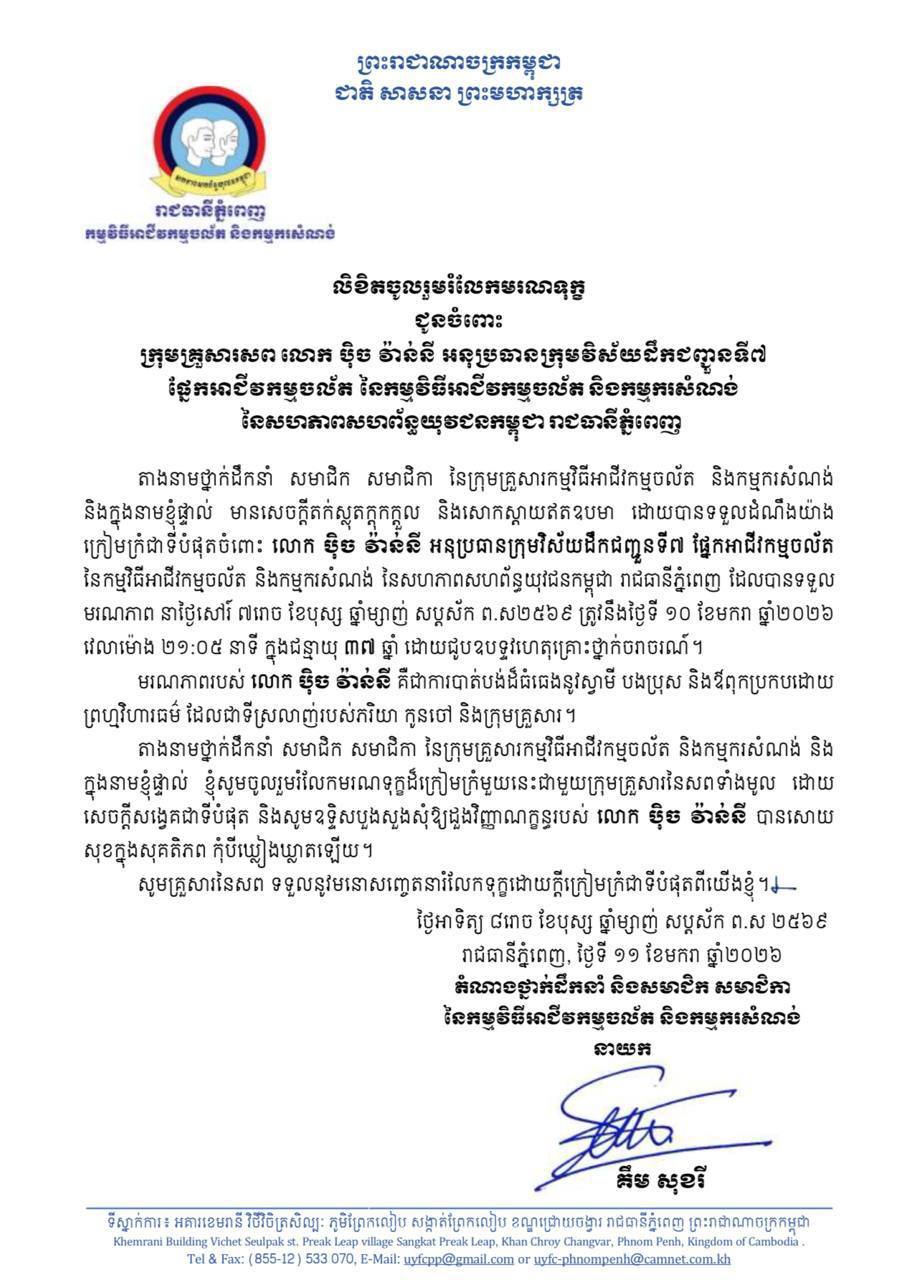 ក្រុមការងារកម្មវិធីអាជីវកម្មចល័តនិងកម្មករសំណង់ចុះសួរ សុខទុក្ខ ដល់ក្រុមគ្រួសារ សពលោក បុិច វ៉ាន់នីអនុប្រធានក្រុមវិស័យដឹងជញ្ជូនទី៧ ផ្នែកអាជីវកម្មចល័ត នៃកម្មវិធីអាជីវកម្មចល័តនិងកម្មករសំណង់នៃស.ស.យ.ករាជធានីភ្នំពេញ ដែលលោកបានទទួលមរណៈភាព កាលពីយប់ ថ្ងៃទី១០ខែមករា ឆ្នាំ២០២៦ដោយបាននាំយកលិខិតរំលែកទុក្ខ បច្ច័យ និងទ័យទាន ដេីម្បីចូលរួមរំលែកទុក្ខជមួយក្រុមគ្រួសារនៃសព។